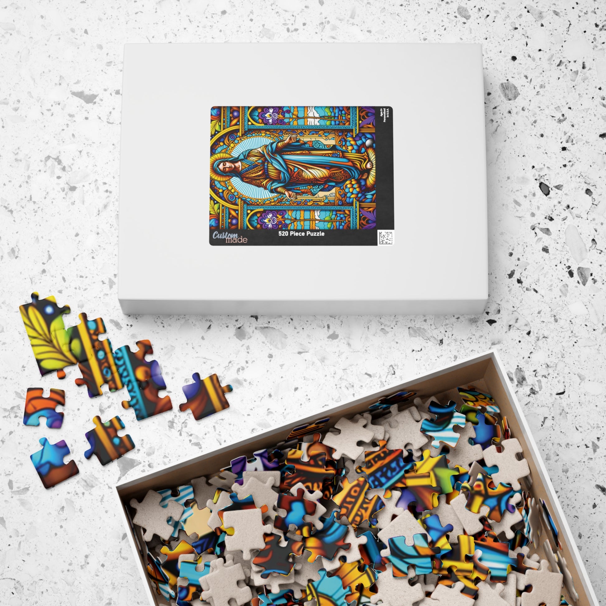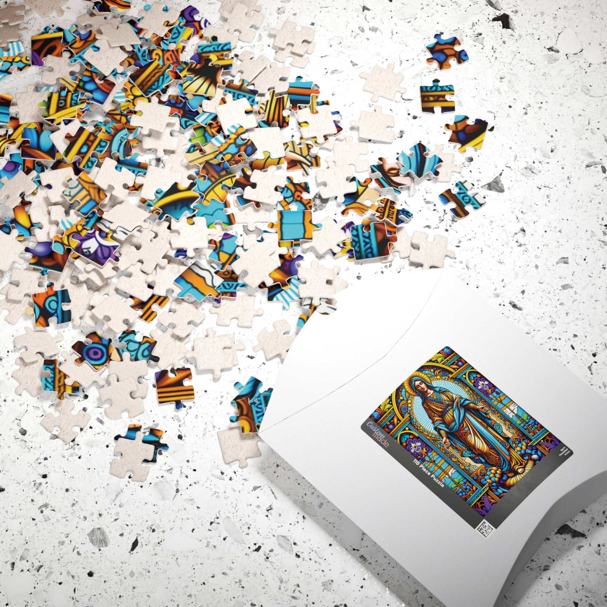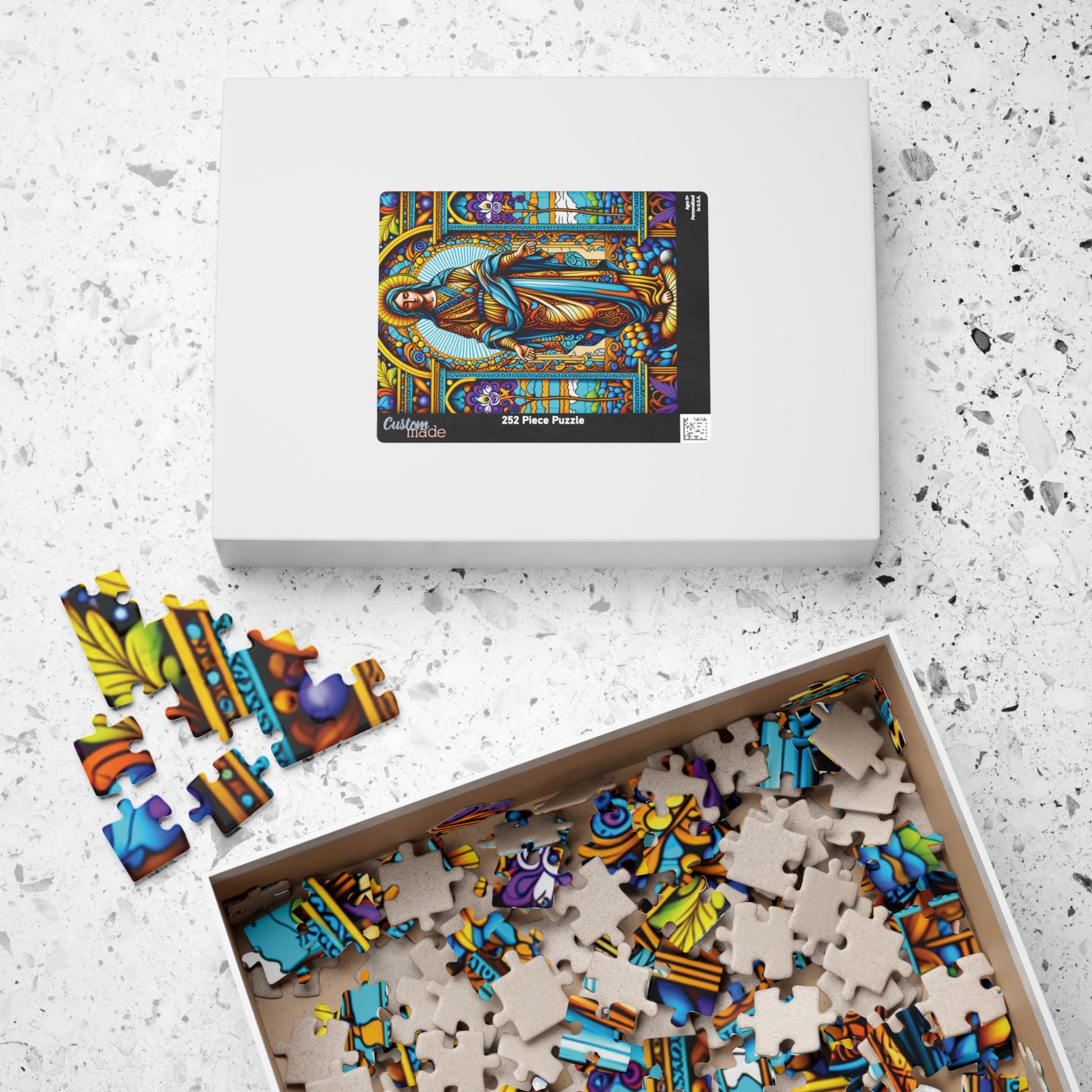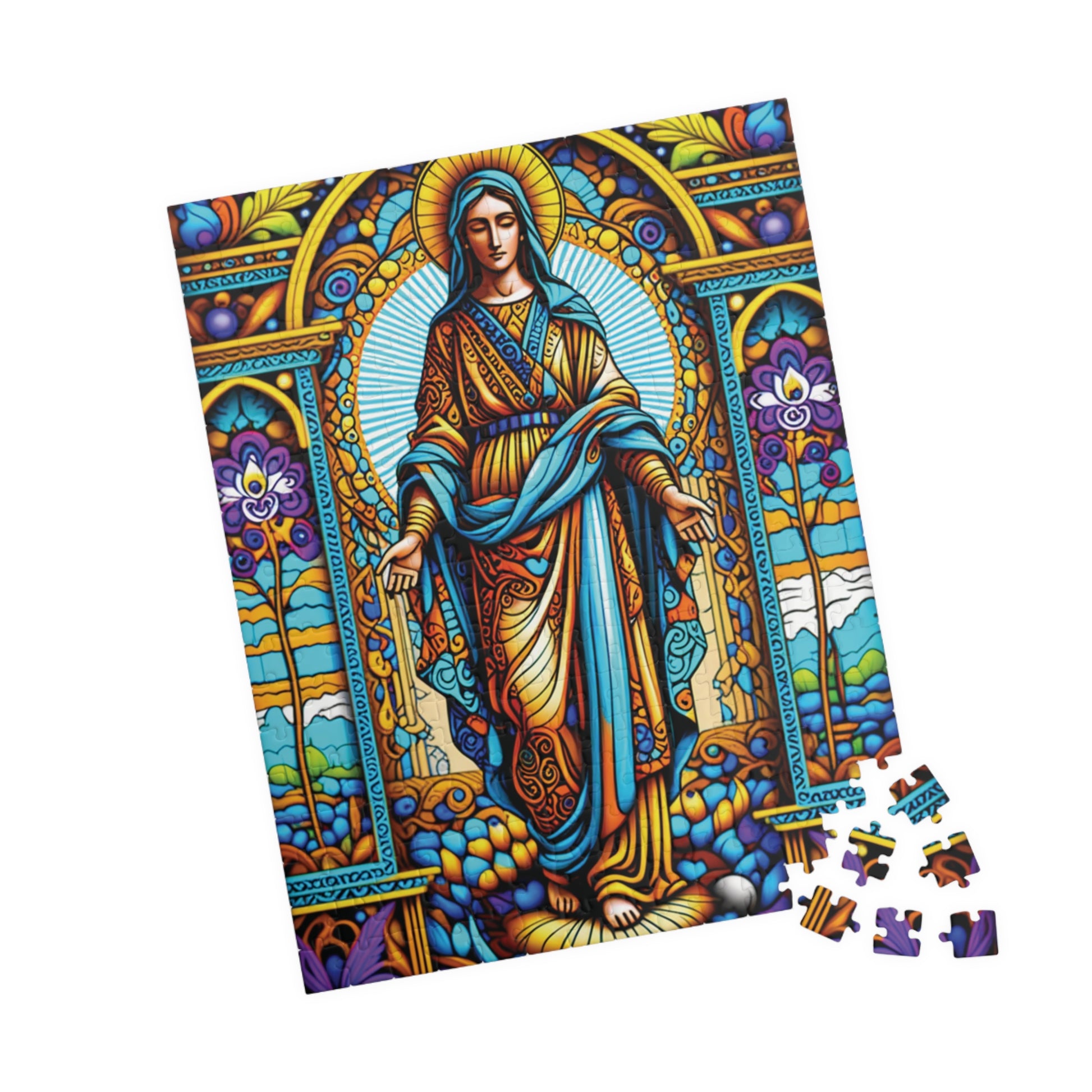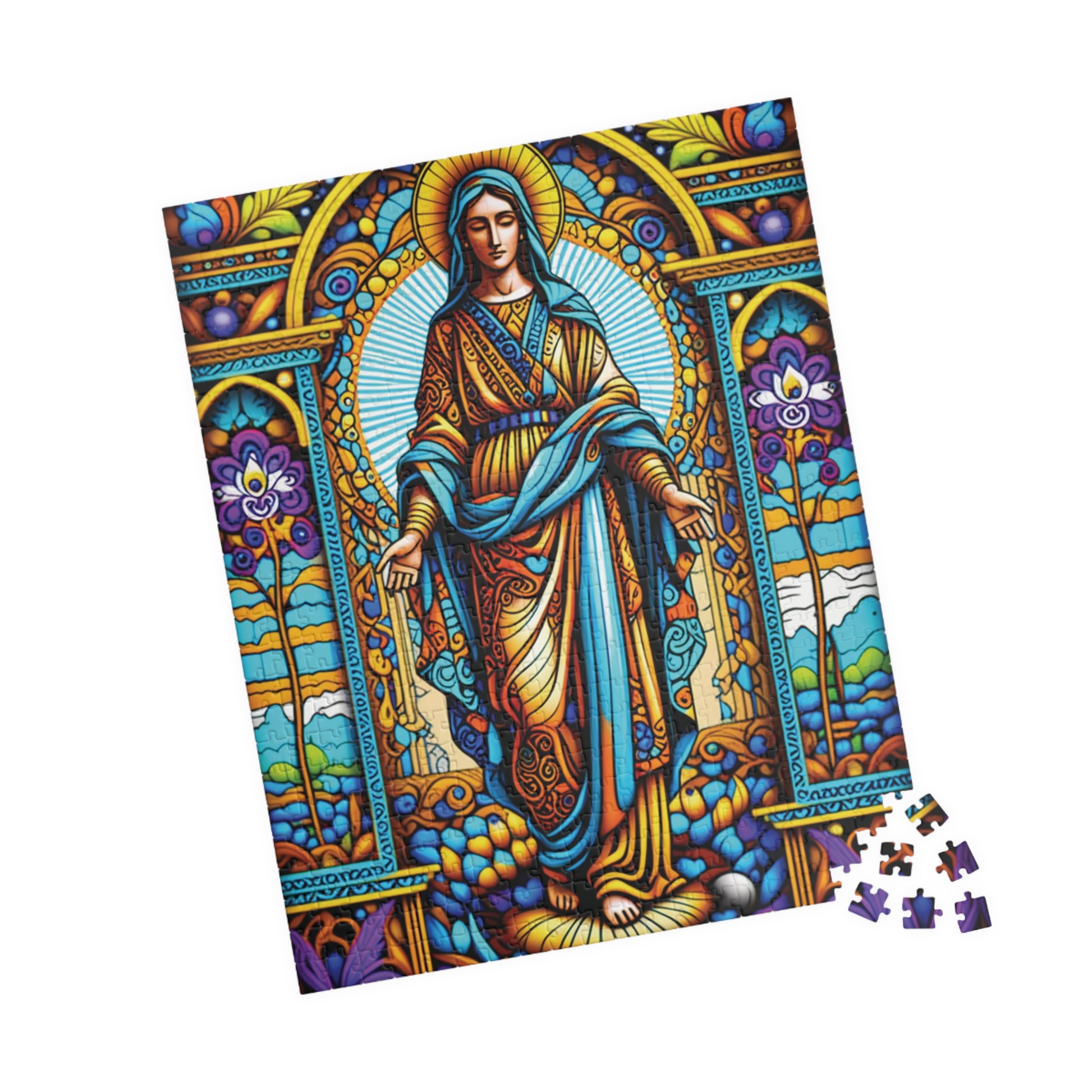 Immerse yourself in the calming beauty of the Stained Glass Virgin Mary Puzzle. This vibrant and intricately designed puzzle is perfect for those who enjoy a peaceful and meditative activity. It is a great gift for puzzle enthusiasts and art lovers, fitting perfectly into a cozy night at home or a relaxing weekend. Ideal for religious holidays, Christmas, or any occasion that calls for a thoughtful and serene pastime.